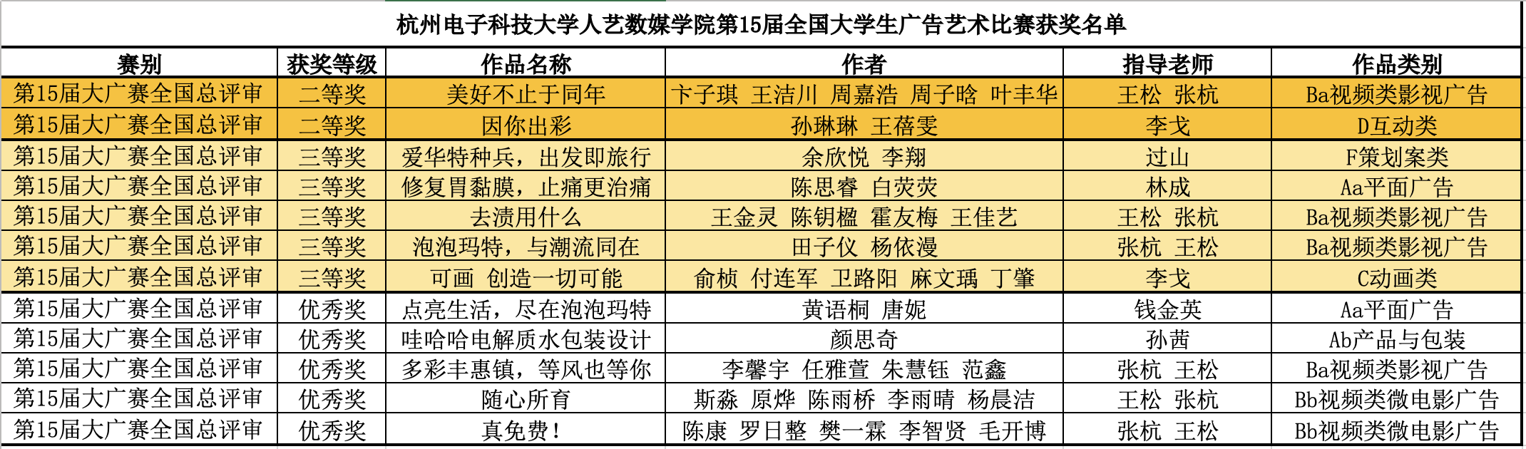 近日,第十五屆大學生廣告藝術大賽全國獎項結果揭曉。此次大賽中,我校共獲得12項全國獎,包括兩項全國二等獎、五項全國三等獎和五項全國優秀獎,在浙江省高校中名列前茅,也是歷年參賽獲得的最佳成績。