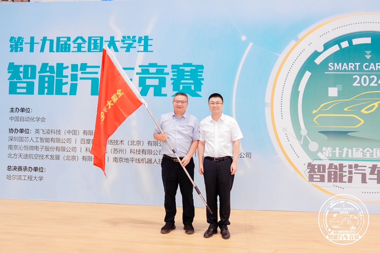 8月22日下午,李文鈞副校長(zhǎng)作為嘉賓出席總決賽閉幕式賽旗交接儀式,從哈爾濱工程大學(xué)副校長(zhǎng)趙玉新手上接過(guò)全國(guó)大學(xué)生智能汽車競(jìng)賽賽旗。2025年,第二十屆全國(guó)大學(xué)生智能汽車競(jìng)賽總決賽將由我校承辦。