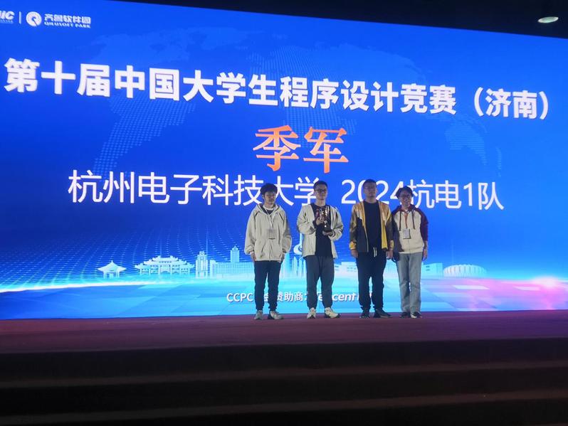 本次CCPC濟南賽區的比賽我校共有3支隊伍入圍,除了獲得季軍的隊伍以外,由卓越學院2023級王佳棟、卓越學院2023級劉億臻、卓越學院2023級吳啟航組成的“2024杭電7隊”,計算機學院2022級蔡煒權、計算機學院2022級許思杰、卓越學院2022級范宇航組成的“2024杭電5隊”也分別獲得銀牌和銅牌的好成績。