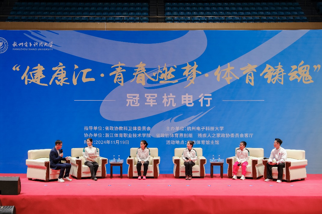 11月19日下午,在省政協教科衛體委員會的大力支持下,由杭州電子科技大學主辦,浙江體育職業技術學院、省政協體育界別組、殘疾人之家政協委員會客廳協辦的“健康匯·青春燃夢·體育鑄魂”——冠軍杭電行活動在杭州電子科技大學體育館主館成功舉行。本次活動邀請到8位曾在奧運、亞運等世界頂尖運動盛會中為國爭光、勇奪金牌的杰出運動員,分享他們與夢想的青春故事。浙江省政協委員、教科衛體委專職副主任、分黨組副書記劉紅祥,校黨委書記吳卿、黨委副書記錢波,浙江省政協委員、體育界別組組長、省黃龍體育中心副主任潘華群,以及省政協教科衛體委、學校體育教學部、團委、學工部、國際教育學院相關負責人和學校師生代表們2000余人共同參與活動。