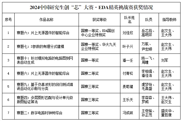 來自北京郵電大學、中山大學、北京大學、西南交通大學、東南大學、華中科技大學、華南理工大學、杭州電子科技大學等8所高校的隊伍脫穎而出,獲得各自賽題第一名。其中,我校EDA技術創新中心的3支隊伍分別獲得賽題六、七和十的第一名并獲得國賽一等獎。此外,還有1支隊伍獲國賽二等獎、3支隊伍獲國賽三等獎。