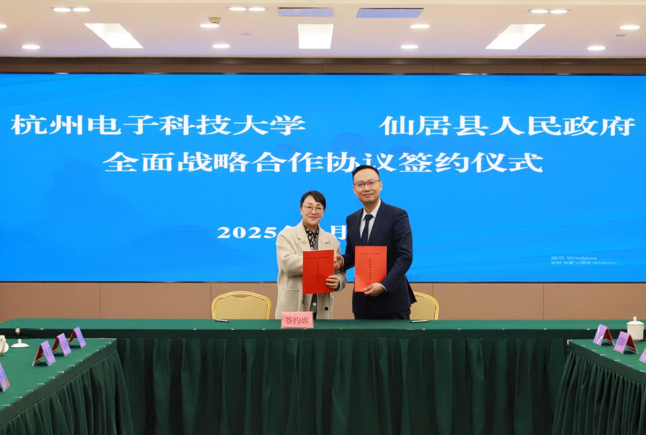 1月10日,杭州電子科技大學與仙居縣人民政府簽署全面戰(zhàn)略合作協(xié)議,進一步深化雙方合作關(guān)系,拓展合作領(lǐng)域,提升合作水平,推動更高質(zhì)量共同富裕共同發(fā)展。浙江省總工會常務委員、省教育工會主席王玉慶;校黨委副書記錢波,校黨委委員、組織部(統(tǒng)戰(zhàn)部)部長孔萬增;仙居縣政府黨組成員、副縣長張騰飛;仙居縣相關(guān)單位、鄉(xiāng)鎮(zhèn)和企業(yè)負責人,我校組織部、宣傳部、產(chǎn)學研合作處融合發(fā)展中心、工會、后勤服務中心等相關(guān)部門負責人出席簽約儀式。