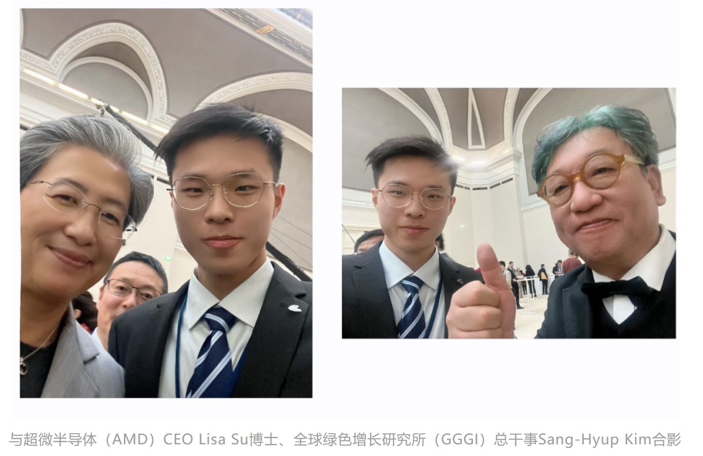 峰會(huì)期間,黃一馬同學(xué)積極參與,并與超微半導(dǎo)體(AMD)CEO Lisa Su博士、全球綠色增長(zhǎng)研究所(GGGI)總干事Sang-Hyup Kim等在內(nèi)的多位全球?qū)<摇⒄咧贫ㄕ呒靶袠I(yè)領(lǐng)袖們進(jìn)行了深入交流。