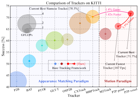 實驗:所提出的方法分別在KITTI、nuScenes和Waymo三大公開點云跟蹤基準數據集上進行了全面驗證。實驗結果顯示,無論是在準確率(Accuracy)、成功率(Success)還是運行速度(FPS)等指標上,所提方法均顯著優于當前主流方法,展現出兼具高性能與高效率的領先優勢,充分驗證了模型設計的有效性與推廣性。該成果為激光雷達點云目標跟蹤的實用化和產業化落地奠定了堅實基礎。