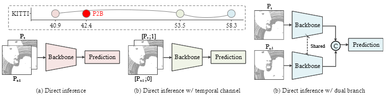 探索:該論文圍繞激光雷達點云單目標跟蹤任務,首先對現有主流跟蹤框架進行了系統性的探索性實驗,旨在厘清不同跟蹤范式與結構之間的關系與優劣,如圖1所示。通過對比分析傳統外觀匹配方法、運動建模方法及其組合模型的性能表現,作者發現:與復雜的外觀匹配和運動建模相比,簡潔而高效的運動結構在激光雷達點云中同樣能夠實現高精度、高魯棒性的目標跟蹤。這一實驗結論為后續研究提供了明確方向,也凸顯了在稀疏、不規則的點云環境中,運動信息在目標定位任務中的核心價值。