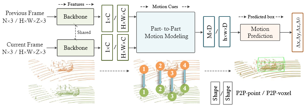 架構:在上述探索結果的基礎上,論文設計了一種新穎的“部件對應部件”式細粒度運動建模機制。該方法通過挖掘目標在連續兩幀點云中的局部結構變化,實現對目標整體運動趨勢的精準建模。不同于傳統的剛體或全局中心運動估計方式,本方法強調對目標關鍵部件之間的對應關系進行細粒度建模,從而提升在復雜場景中對遮擋、形變和多目標干擾下的魯棒性與準確率。該方法有效結合了結構先驗與數據驅動建模,為點云運動建模提供了新的思路。基于這個設計,論文構建了一套通用的點云運動建模框架,如圖2所示。