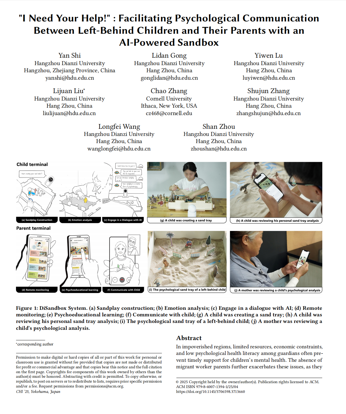 4月26日至5月1日,在剛剛落幕的國際頂級學術會議ACM CHI 2025上,我校人文藝術與數字媒體學院、法學院施妍副教授團隊憑借創新性研究成果《"I Need Your Help!" : Facilitating Psychological Communication Between Left-Behind Children and Their Parents with an AI-Powered Sandbox》,從全球5020篇投稿中突破重圍(錄取率24.9%),最終斬獲大會最佳論文榮譽提名獎(全球授予比例僅為5%),并應邀在橫濱主會場進行成果匯報。