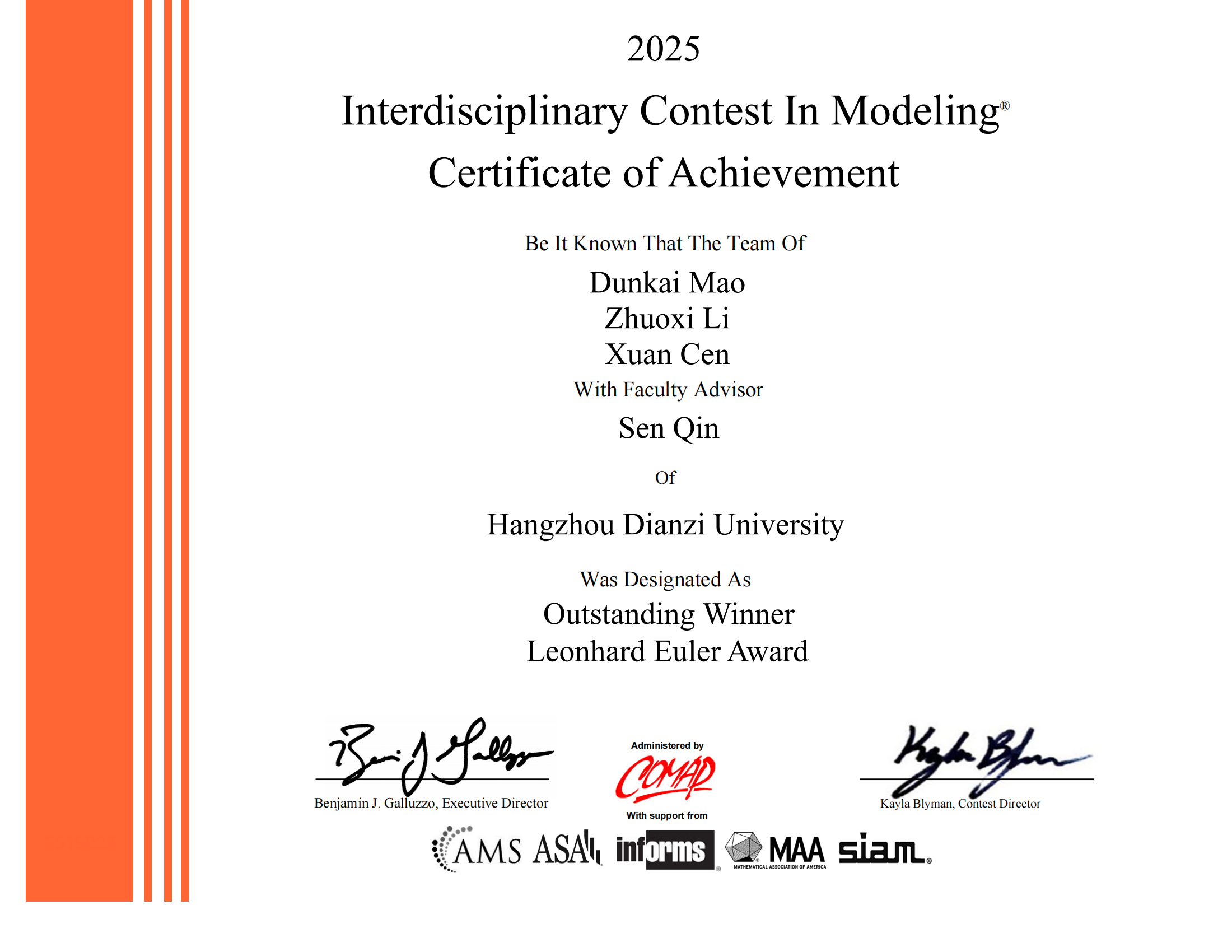 2025年美國大學生數學建模競賽和交叉學科建模競賽(MCM/ICM)成績近日揭曉,我校學子再創佳績,由卓越學院毛頓開、李卓曦和岑萱組成的參賽隊從全球27456支隊伍中脫穎而出,不僅榮獲特等獎(Outstanding Winner,獲獎率為0.142%),更一舉摘得賽事最高榮譽之一的歐拉獎(Leonhard Euler Award)。這是我校首次獲得該賽事的冠名獎項,也是自2006年參賽以來第三次斬獲特等獎。