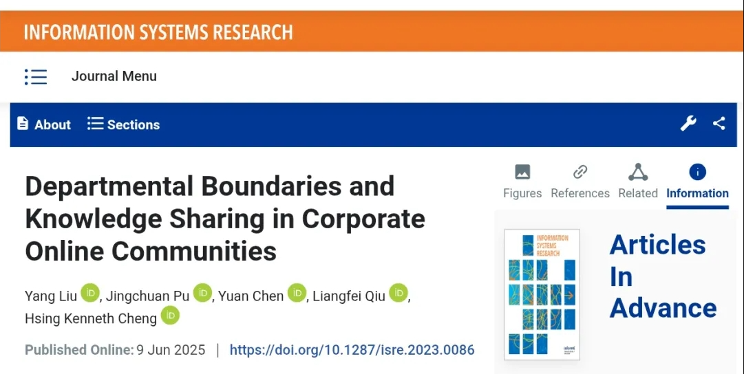 近日,杭州電子科技大學管理學院副研究員劉陽博士以第一作者身份在信息管理領域國際頂級期刊《Information Systems Research》(ISR)在線發表題為《Departmental Boundaries and Knowledge Sharing in Corporate Online Communities》的研究論文。該期刊是美國德克薩斯大學達拉斯分校(UTD)遴選的全球商學院最頂尖24種學術期刊(UTD24)之一,代表著管理學科的最高研究水平,其發表標志著研究成果獲得了國際同行的廣泛認可。