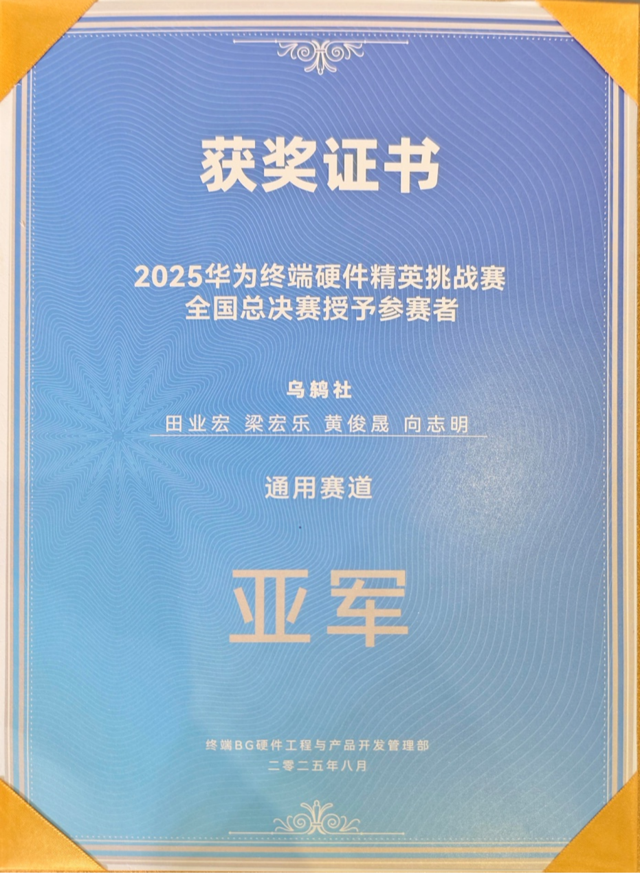 8月1日至3日,2025年華為終端硬件精英挑戰賽全國總決賽在東莞松山湖三丫坡體育館隆重舉行。經過華中、華東、華南等六大賽區的激烈角逐,由杭電電子信息學院研究生領銜的“烏鶇社”戰隊從全國400余支參賽隊伍中脫穎而出,成功晉級全國總決賽。在華為東莞松山湖歐洲小鎮這一創新高地,團隊與全國頂尖選手同臺競技,最終斬獲硬件通用賽道全國亞軍的殊榮。
