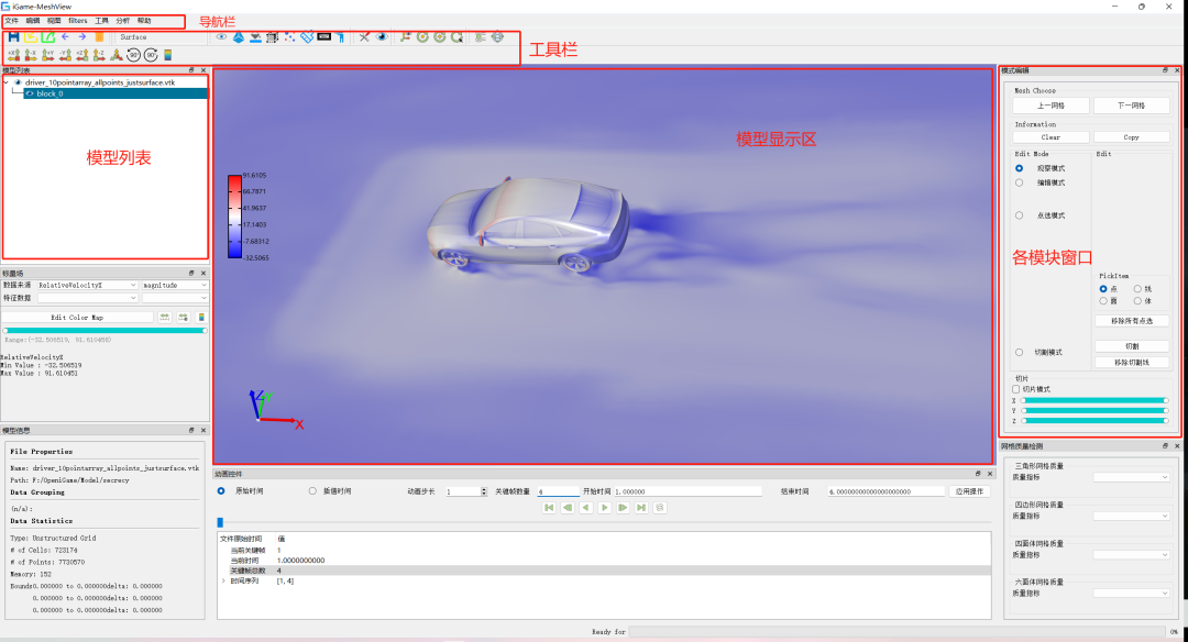 1. 高效核心數據結構設計:支持多種表面網格、體網格及混合網格的處理,同時兼容CAE仿真中的標量、矢量和張量科學計算數據類型,實現精準而豐富的可視化效果。
