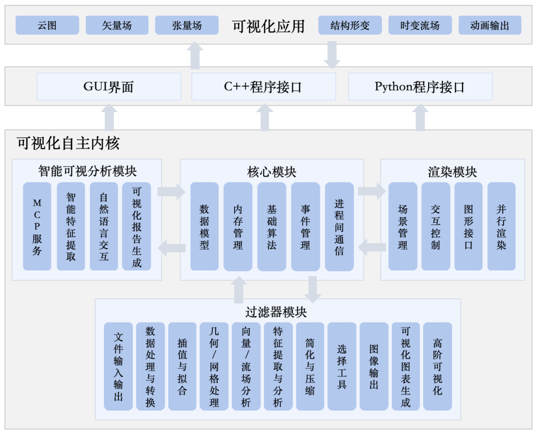 1. 核心模塊、過濾器模塊、渲染模塊和智能可視分析模塊共同構成內核系統。內核系統內部各模塊通過接口機制協同工作,實現模塊間的解耦與高效協作。GUI模塊則為內核系統提供用戶界面支持,承擔與用戶交互的功能。