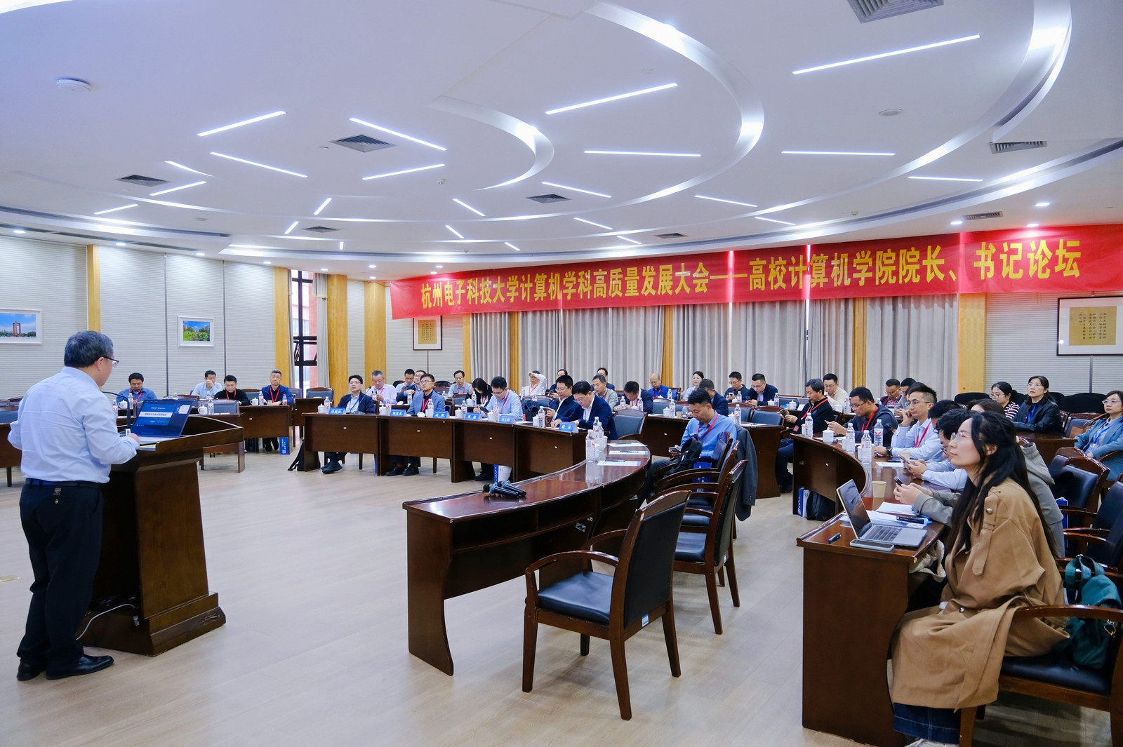 會上,陳積明校長發(fā)表致辭。他強調(diào),計算機學科作為浙江省登峰學科和學校重點學科,要強化基礎研究、突破關(guān)鍵核心技術(shù)、服務國家戰(zhàn)略需求,進一步凝練特色優(yōu)勢、實現(xiàn)高質(zhì)量內(nèi)涵式發(fā)展。隨后,徐崗作學科發(fā)展專題匯報,系統(tǒng)回顧了學科45年來的建設歷程、標志性成果與未來規(guī)劃。為提升學科建設的戰(zhàn)略性、前瞻性與科學性,本次會議特別組建“計算機科學與技術(shù)學科專家組”,聘任朱文武(清華大學ACM Fellow、歐洲科學院外籍院士)、羅笑南(桂林電子科技大學學術(shù)委員會主任)、蔣云良(浙江師范大學黨委書記)等12位國內(nèi)知名高校計算機領域?qū)<覔纬蓡T。專家組對杭電計算機學科的發(fā)展定位、方向布局與機制創(chuàng)新給予高度評價,并提出建設性指導意見。