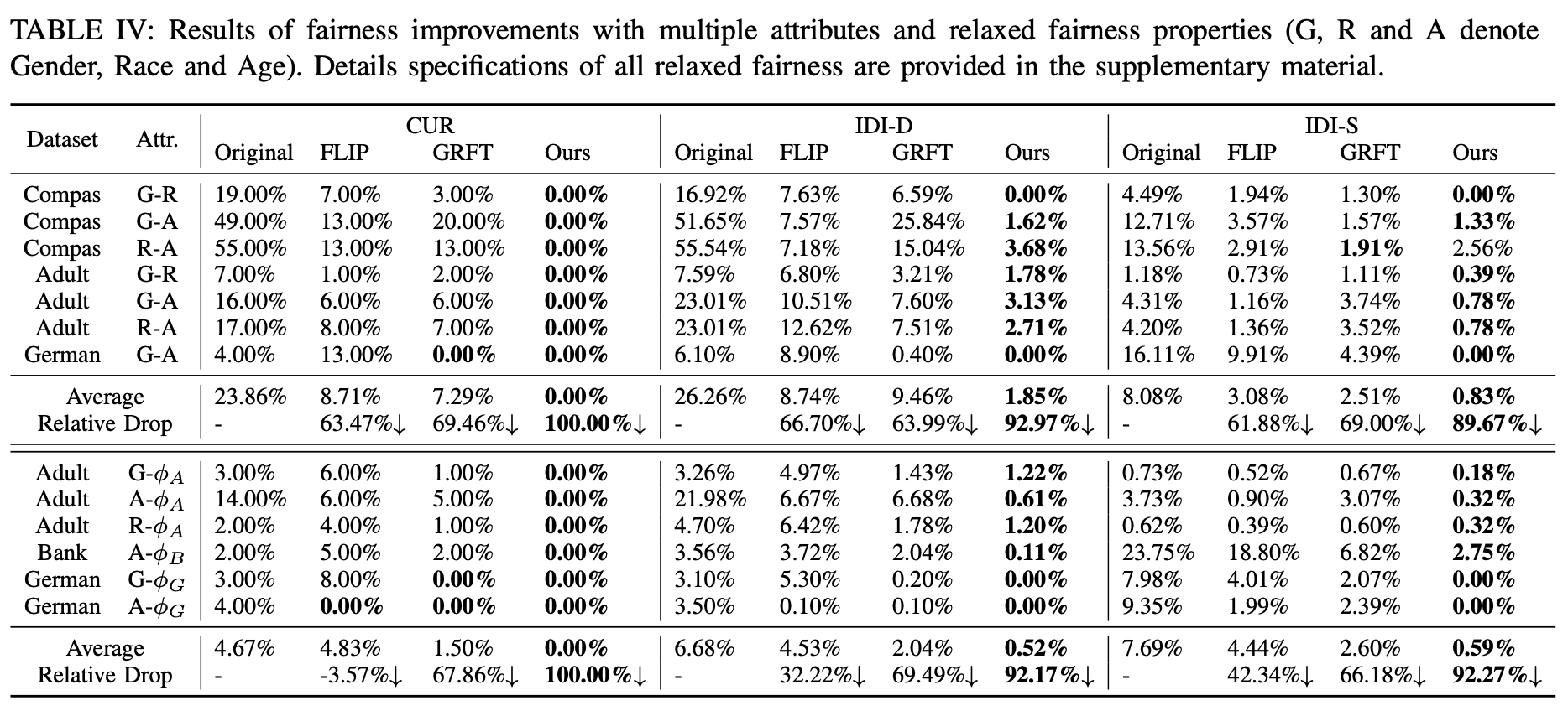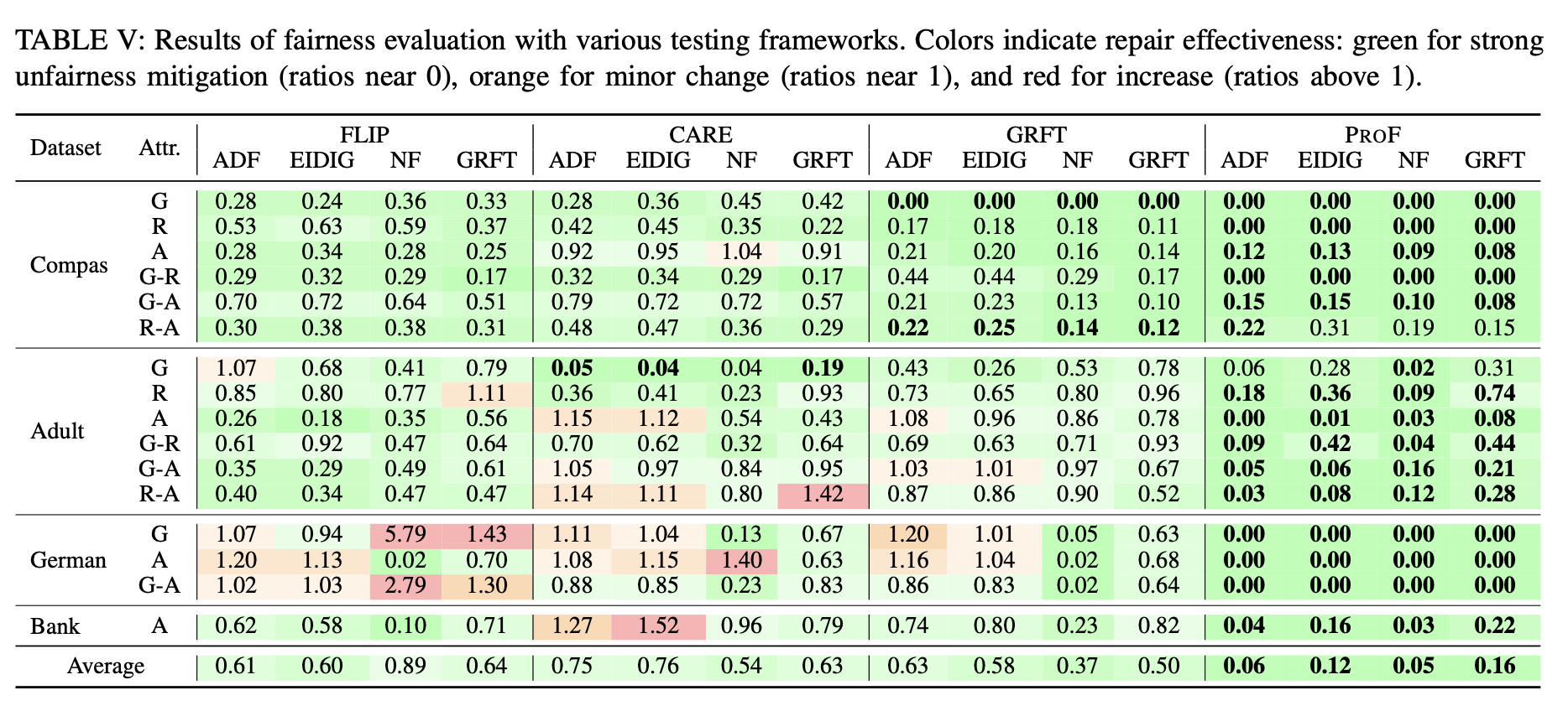 實(shí)驗(yàn)結(jié)果表明,PROF 在四個(gè)主流基準(zhǔn)數(shù)據(jù)集上均實(shí)現(xiàn)了顯著的公平性提升。在修復(fù)集上,PROF 能夠?qū)崿F(xiàn) 100% 可證明的公平性修復(fù);在完整數(shù)據(jù)集和全輸入空間上的泛化率分別達(dá)到 95.93% 和 93.16%,遠(yuǎn)超現(xiàn)有最優(yōu)方法(71.44% 和 72.67%)。此外,PROF 還能靈活擴(kuò)展以支持多敏感屬性和更復(fù)雜的公平性定義,平均提升約 90%,并在多種公平性測(cè)試框架下保持穩(wěn)定表現(xiàn),充分展示了其理論可靠性與實(shí)際適用性。
