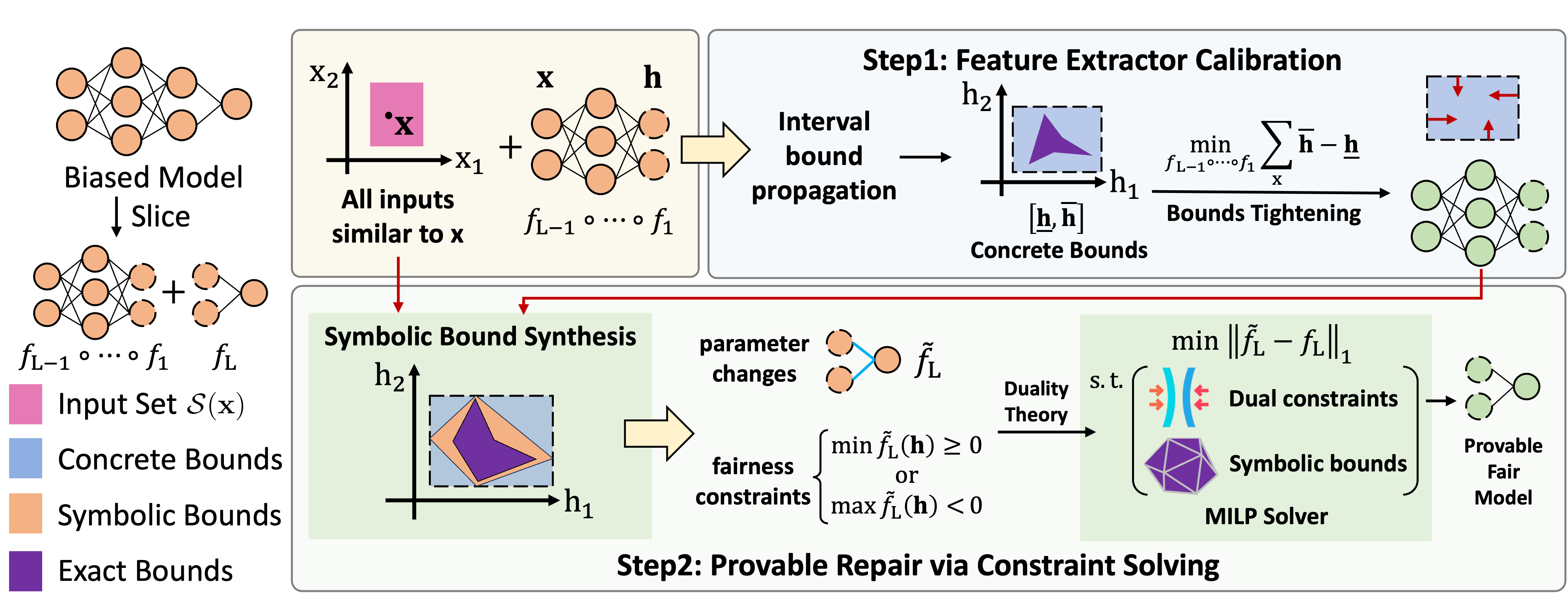 ProF包含兩個(gè)核心階段:首先使用區(qū)間邊界傳播(Interval Bound Propagation)技術(shù),對(duì)模型在偏見樣本相似集合上的輸出范圍進(jìn)行可靠刻畫,從而識(shí)別并收緊偏見行為。在第二階段,ProF進(jìn)一步合成更精確的符號(hào)邊界,并基于這些邊界將公平性約束與模型參數(shù)變化構(gòu)建為約束求解問題。通過引入對(duì)偶理論,ProF消除其中的非線性項(xiàng)同時(shí)保留約束的健全性。得到的MILP可由現(xiàn)有求解器高效求解,最終得到具備可證明公平性保障的修復(fù)模型。