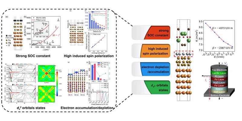 針對上述挑戰,周鐵軍/顏士明團隊持續深耕于磁性異質結的磁各向異性的電壓調控機制研究。團隊從理論層面出發,基于磁各向異性能的二階微擾理論首次明確了自旋-軌道耦合(SOC)常數和自旋極化與VCMA系數的關系。在此基礎上,團隊進一步對具有高SOC常數的Pt原子覆蓋的Pt/Fe/MgO異質結展開了軌道層面與結構調整的系統研究。計算結果進一步確認除了原子SOC常數與自旋極化外,原子附近的電荷累積/耗盡以及Pt原子費米能級附近dz2軌道能態的分布,同樣是影響Pt/Fe/MgO異質結VCMA系數不可或缺的因素,四者共同決定了異質結的磁各向異性的電場響應。