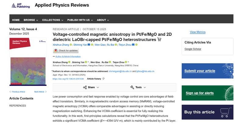 近日,我校電子信息學院磁電子器件與系統團隊在磁性異質結的電壓控制磁各向異性研究領域取得創新性研究成果。相關工作以“Voltage-controlled magnetic anisotropy in Pt/Fe/MgO and 2D dielectric LaOBr-capped Pt/Fe/MgO heterostructures”為題發表于美國物理聯合會旗下的旗艦期刊《Applied Physics Reviews》(IF:11.6)。2023級碩士研究生張欣卓為論文第一作者,電子信息學院周鐵軍教授、顏士明副教授為論文通訊作者,杭州電子科技大學為論文第一通訊單位。