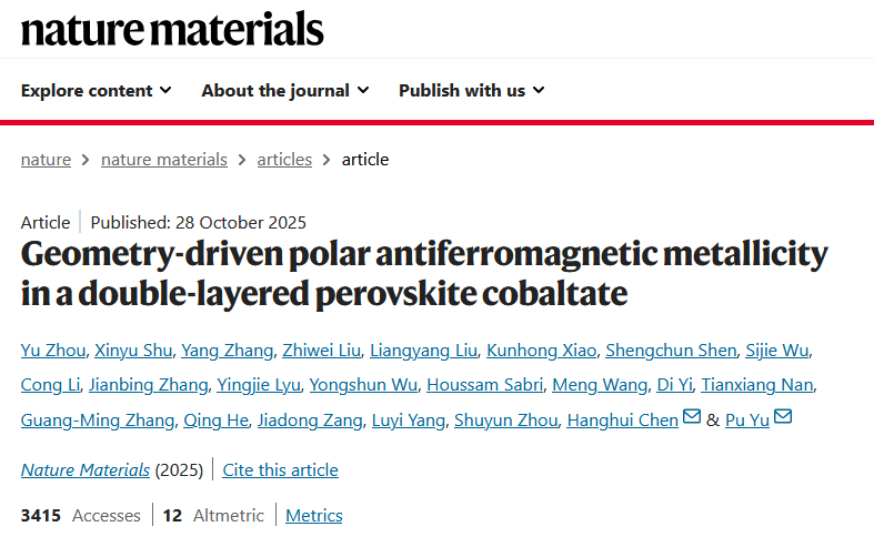 近日,電子信息學院磁電子器件與系統團隊成員舒新愉副教授與合作者在關聯材料研究領域取得重要進展。研究團隊在國際上首次成功制備出高質量雙層鈣鈦礦結構Sr3Co2O7單晶薄膜,并在該材料中實現了反鐵磁性、極性與金屬性三種傳統上不相容物性的協同共存。該研究結果以Geometry-driven polar antiferromagnetic metallicity in a double-layered perovskite cobaltate為題,發表于《自然·材料》(Nature Materials)。其中,舒新愉副教授為本文的共同第一作者。