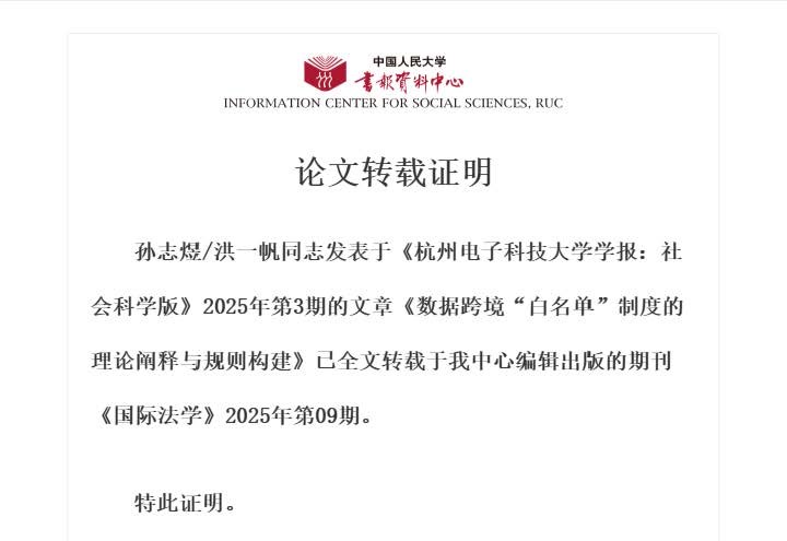 近日,學報作者孫志煜、洪?帆同志發表于《杭州電子科技大學學報(社會科學版)》2025年第3期的文章《數據跨境“白名單”制度的理論闡釋與規則構建》被中國人民大學書報資料中心復印報刊資料《國際法學》2025年第9期全文轉載。