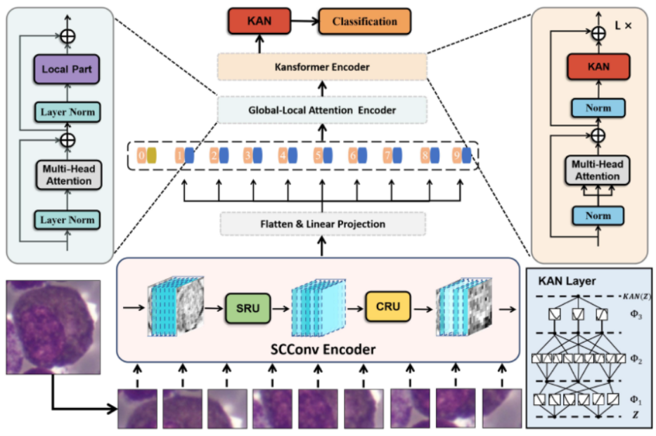 惡性腫瘤(如急性白血病)的發病率和死亡率顯著上升。臨床上,醫院依靠外周血和骨髓涂片的細胞學檢查來診斷惡性腫瘤,準確的血細胞計數至關重要。現有的自動化方法在處理高維顯微圖像數據時面臨特征表達能力低、可解釋性差以及特征提取冗余等問題。論文提出了一種用于骨髓血細胞的新型細粒度分類模型SCKansformer,該模型解決了上述問題,并提高了分類的準確性和效率。該模型集成了Kansformer編碼器、SCConv編碼器和全局-局部注意力編碼器:Kansformer編碼器用KAN替代傳統的MLP層,提高了非線性特征表示能力和可解釋性;SCConv編碼器通過空間和通道重建單元增強了特征表示并減少了冗余;全局-局部注意力編碼器結合了多頭自注意力機制和局部部分模塊,以捕獲全局和局部特征。