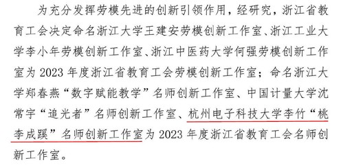 近日,2023年度浙江省教育工會勞模創新工作室和名師創新工作室評選結果公布,我校電子信息學院(集成電路科學與工程學院)李竹領銜的“桃李成蹊”名師創新工作室獲得正式命名,成功入選首批浙江省教育工會名師創新工作室,全省僅有三家工作室獲此殊榮。