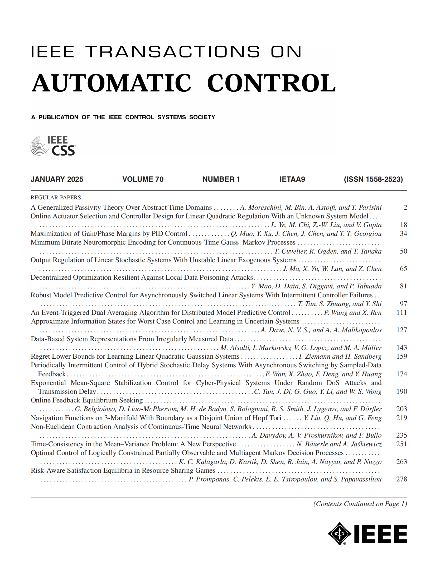 IEEE TAC是自動控制領域的頂級學術期刊,由IEEE CSS出版。該期刊專注于發表控制理論、方法與應用的高質量原創研究,涵蓋系統建模、優化、魯棒控制、自適應控制、網絡化系統、機器人控制等方向。IEEE TAC以其嚴格的審稿標準和高學術影響力著稱,受控制領域研究者高度認可,最新影響因子為6.2,屬于SCI TOP期刊。