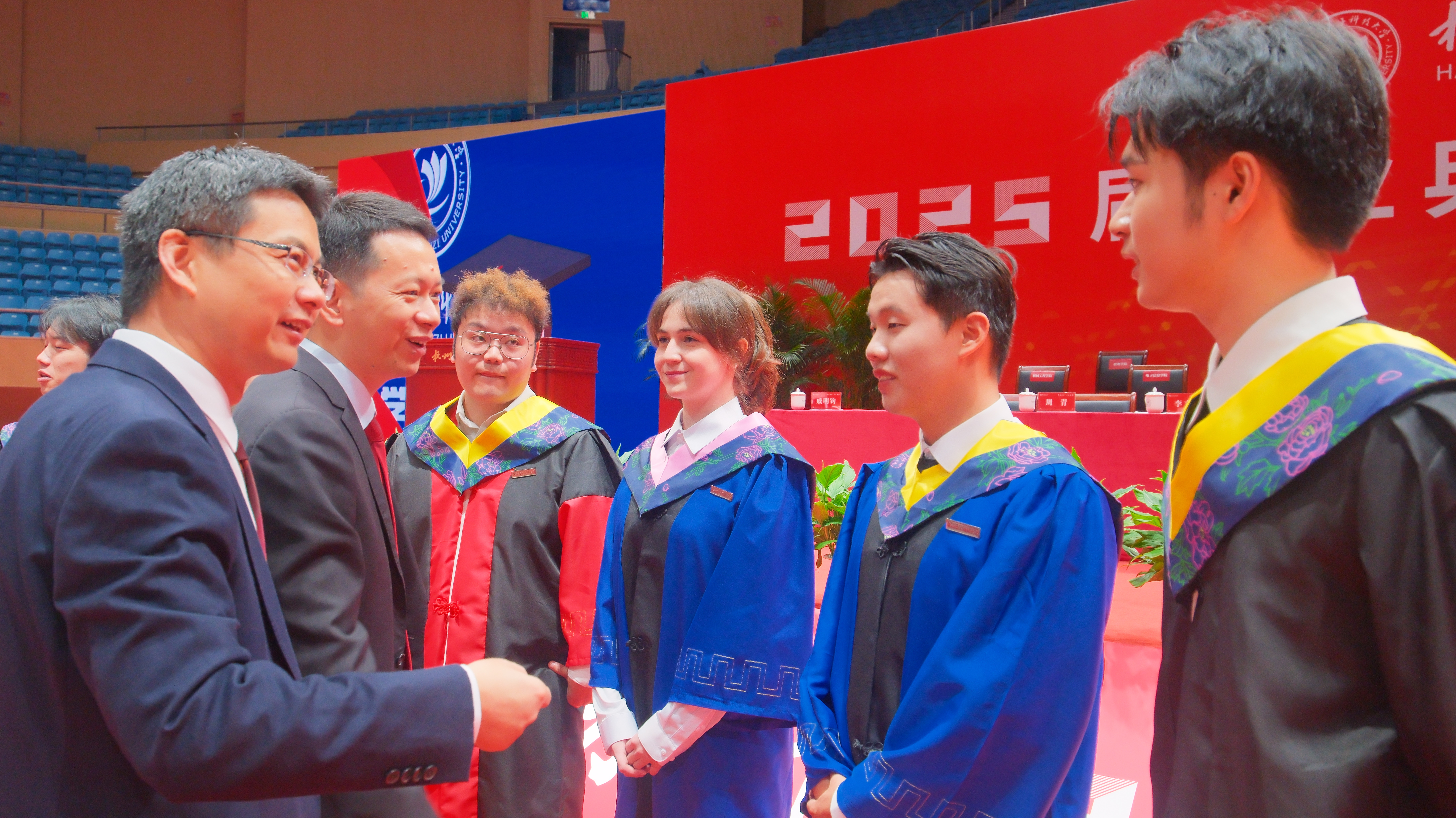 在莊嚴的國歌聲中,畢業典禮正式拉開帷幕。吳卿宣讀優秀畢業生表彰文件,李文鈞宣讀2025屆畢業生畢業文件。本屆畢業生中,涌現出許多優秀學子:電子信息學院博士畢業生劉喚發表高水平論文16篇,留校入職博士后;卓越學院本科生陳鼎斬獲中國國際大學生創新大賽全國金獎,保送浙江大學直博;智能車隊14名成員全員考研“上岸”,即將奔赴頂尖學府深造;人藝數法學院厲彬凌、張天宇從軍營到校園,成就全國散打冠軍并雙雙入職公安系統。他們的奮斗故事,詮釋了杭電人的“篤學力行、守正求新”精神。