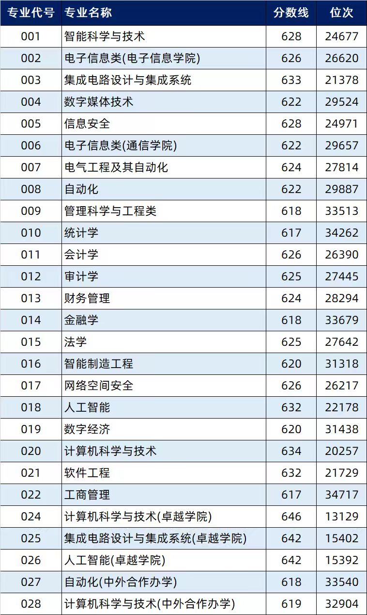 在我校普通類招生的27個(gè)專業(yè)(類)中,計(jì)算機(jī)科學(xué)與技術(shù)(卓越學(xué)院)(646分)、人工智能(卓越學(xué)院)(642分)、集成電路設(shè)計(jì)與集成系統(tǒng)(卓越學(xué)院)(642分)、計(jì)算機(jī)科學(xué)與技術(shù)(634分)、集成電路設(shè)計(jì)與集成系統(tǒng)(633分)、軟件工程(632分)、人工智能(632分)、智能科學(xué)與技術(shù)(628分)、信息安全(628分)、網(wǎng)絡(luò)空間安全(626分)、電子信息類(電子信息學(xué)院)(626分)、審計(jì)學(xué)(625分)、電氣工程及其自動(dòng)化(624分)、財(cái)務(wù)管理(624分)、數(shù)字媒體技術(shù)(622分)、智能制造工程(620分)、數(shù)字經(jīng)濟(jì)(620分)等17個(gè)專業(yè)(類)的投檔分?jǐn)?shù)線均位列省屬同類高校相同或相近專業(yè)第一。同時(shí),杭電圣光機(jī)聯(lián)合學(xué)院的中外合作辦學(xué)專業(yè)(計(jì)算機(jī)科學(xué)與技術(shù)、自動(dòng)化)錄取最低分為618分,位居省屬同類高校的中外合作辦學(xué)同類專業(yè)第一。