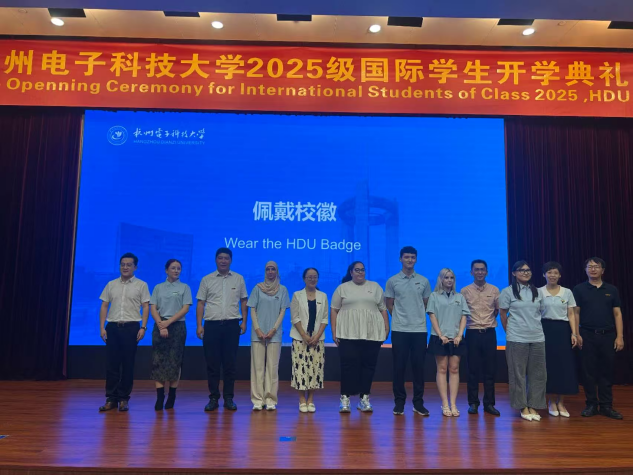 在莊重的佩戴校徽環節,與會領導為國際新生代表佩戴上杭州電子科技大學校徽。這枚小小的校徽,不僅象征著身份,更承載著學校的期望與責任,標志著2025級國際新生正式加入HDU。