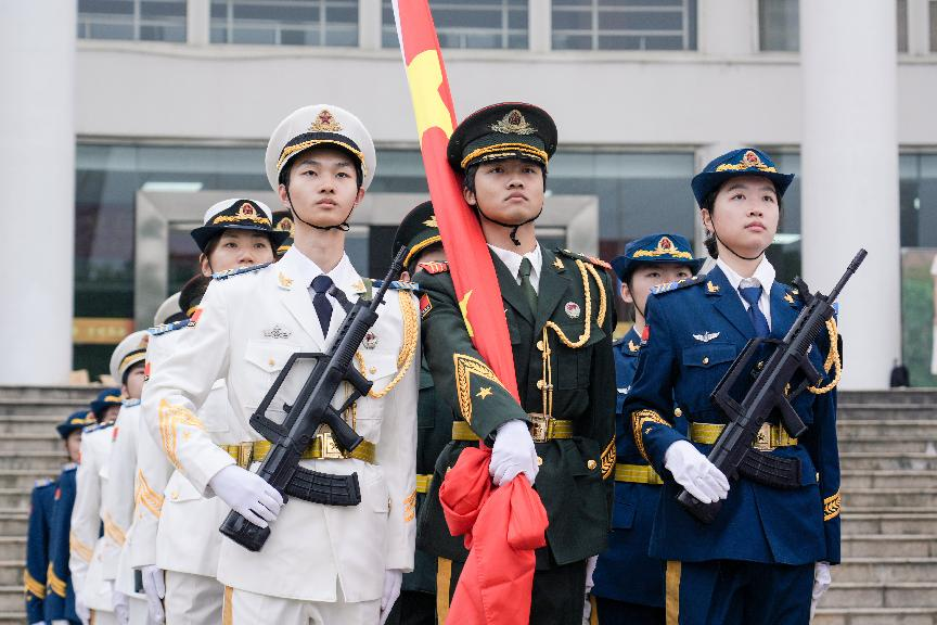 上午8點,升旗儀式正式開始。伴隨著鏗鏘有力的步伐,國旗護衛(wèi)隊護送國旗走向旗桿。在激昂的《義勇軍進行曲》中,五星紅旗冉冉升起,全體師生肅立行注目禮,嘹亮的歌聲回蕩在校園上空,家國情懷在每個人心中激蕩。