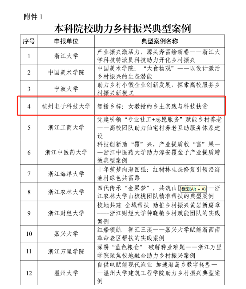 10月21日,浙江省教育廳公布第四屆高校助力鄉(xiāng)村振興典型案例評(píng)選結(jié)果。我校申報(bào)的案例《智援鄉(xiāng)梓:女教授的鄉(xiāng)土實(shí)踐和科技扶貧》成功入選,成為全省15個(gè)本科院校典型案例之一。這也是我校第三次獲此殊榮。