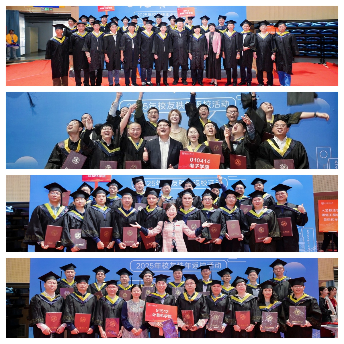 在重溫畢業禮活動中,各學院負責人來到校友合影牌前,以班級為單位,為每一位遠道歸來的秩年校友頒發了精心制作的返校紀念證書。證書雖輕,情意厚重。校友們臉上洋溢著自豪與幸福的笑容,在鏡頭前定格下珍貴一刻。這張合影,不僅記錄了今日重逢的歡顏,更將杭電大家庭的血脈深情永久珍藏。