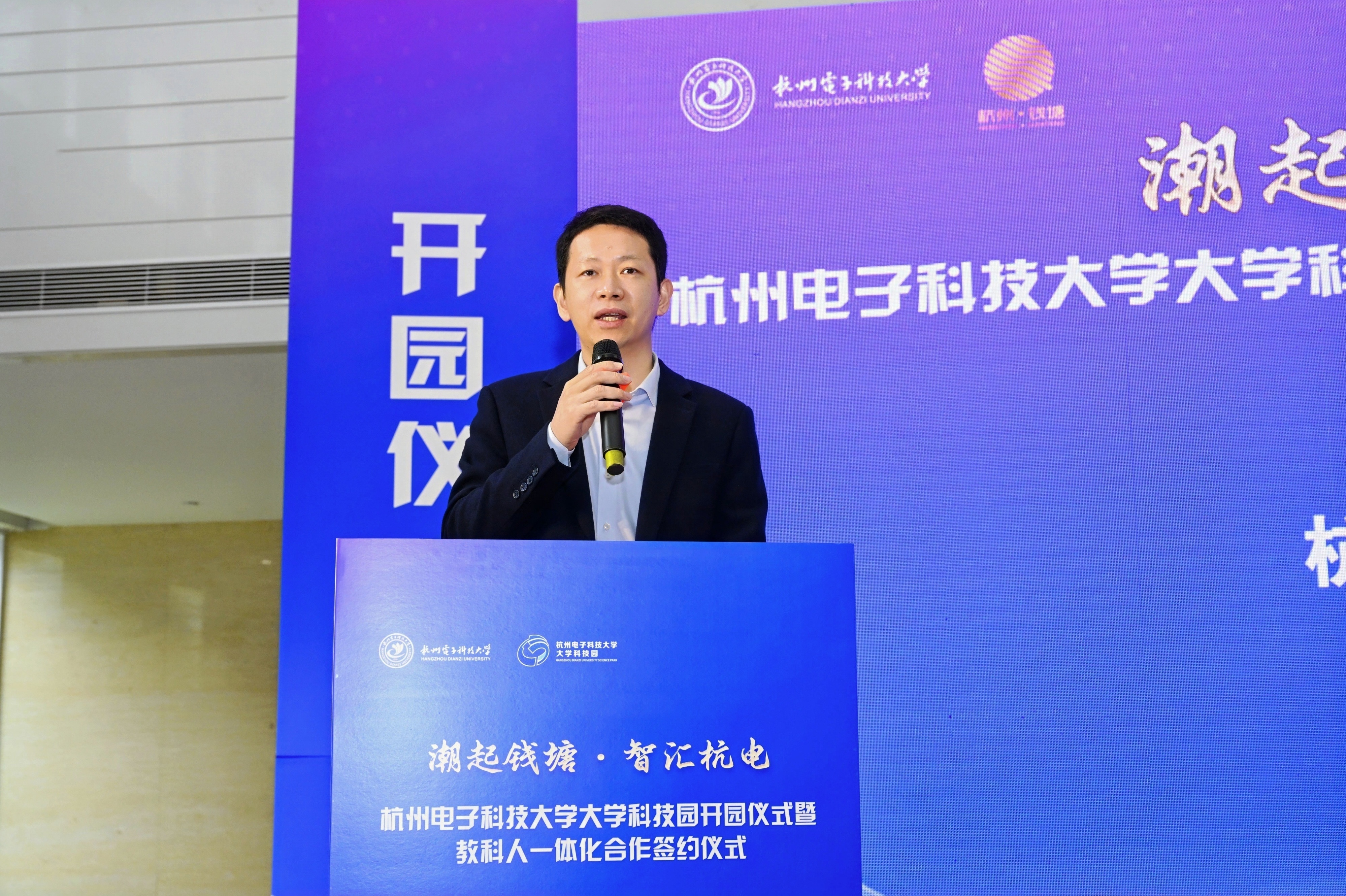 陳積明在致辭中簡(jiǎn)要回顧了學(xué)校的發(fā)展歷程和辦學(xué)成就,指出學(xué)校近年來(lái)在學(xué)科建設(shè)、科研創(chuàng)新等方面取得顯著進(jìn)展。他強(qiáng)調(diào),杭電與錢塘區(qū)長(zhǎng)期緊密合作,科技協(xié)同成效突出,大學(xué)科技園開園是區(qū)校合力推動(dòng)成果轉(zhuǎn)化的重要成果。他表示,大學(xué)科技園將致力于打造人才集聚地、創(chuàng)業(yè)孵化地和產(chǎn)教育人新高地,期待政產(chǎn)學(xué)研多方協(xié)同,共同推動(dòng)科技創(chuàng)新與產(chǎn)業(yè)發(fā)展深度融合,為“創(chuàng)新浙江”建設(shè)貢獻(xiàn)杭電力量。