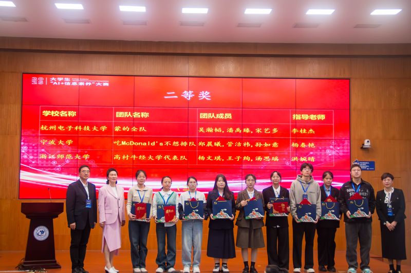 經過激烈角逐,最終評選出特等獎 5 名、一等獎 8 名、二等獎 13 名、三等獎 24 名。三個賽道的特等獎分別由浙江財經大學、浙大城市學院、浙江工業大學、金華職業技術大學和寧波衛生職業技術學院的參賽隊伍斬獲。我校“蒙的全隊”“信息素養攻堅隊”等 5 支隊伍分獲本研組二、三等獎。校圖書館榮獲本科院校優秀組織獎。李桂杰、盧堅、胡海燕、王琳、李陽獲“優秀指導教師獎”。